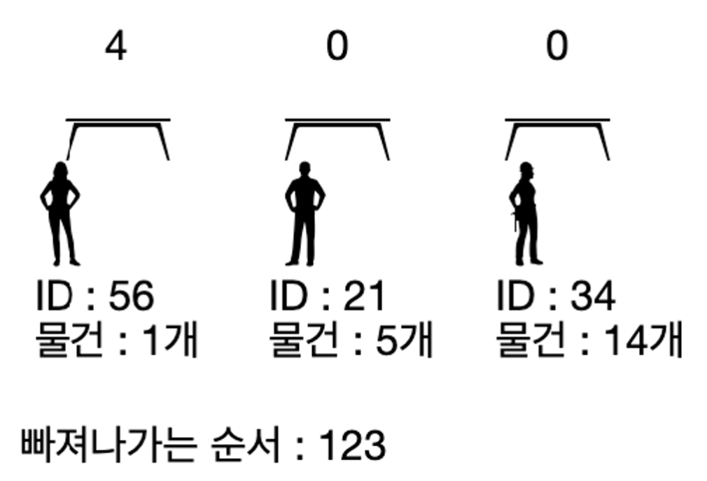 물건 4개를 가진 123번의 계산이 가장 먼저 끝납니다. 4분에 123번이 빠져나가고 다음 순서인 56번이 들어오게 됩니다.