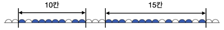채소를 기르는 이랑의 크기를 확인해보면 왼쪽이 10칸, 오른쪽이 15칸 입니다. 따라서 왼쪽에 2캐의 바람막이를, 오른쪽에 3개의 바람막이를 설치하여 총 5개의 바람막이를 사용하면 됩니다.