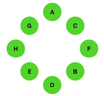 F는 A와 D 옆이 아니기 때문에 H의 맞은편이 되고, G와 C 사이에는 한 사람이 있기 때문에 그 한 사람이 A가 되고, A의 오른편이 C가 됩니다. 마지막으로 나머지 한 자리는 B가 됩니다.