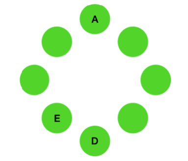 시뮬레이션을 통해 문제를 해결할 수 있습니다. 제일 먼저 첫 번째 조건으로 D는 A의 맞은편에 앉아야 합니다. 그리고 마지막 조건으로 E는 D의 왼쪽 옆에 앉아야 합니다.