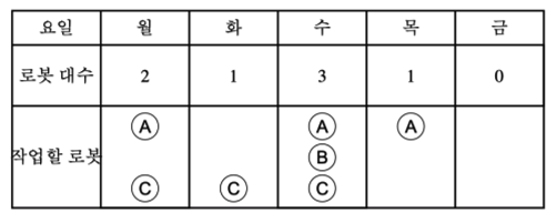 마지막으로 월요일은 A, C가 작업 가능합니다. 만약 월요일에 B가 작업을 한다면 C와 같이 작업하는 것은 가능하지만 화요일에 C가 점검이 필요하다는 것에 만족하지 못합니다.