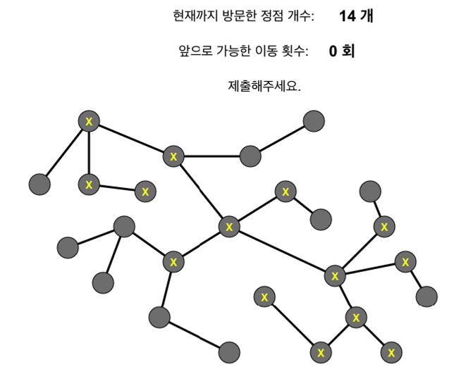 따라서 3이나 25에서 시작해서 중간중간 방문할 수 있는 곳을 방문해 가면서 총 14 정점을 방문하도록 하면 됩니다. 아래는 정답의 예시 입니다.