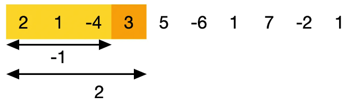 누적합으로 바꿔 해결을 했지만 좀 더 생각해보면 투 포인터 방식처럼 양쪽에 포인터를 두면 반복문을 하나만 써도 풀이가 가능해 보입니다. 하지만 막상 투 포인터 방식을 사용하려면 왼쪽 포인터를 언제 움직여야할지 애매합니다. 잘 생각해보면 합계의 최대값을 계속 저장하다가 합계가 현재의 숫자보다 작다면 더 이상 해당 합계를 사용하지 않으면 됩니다.