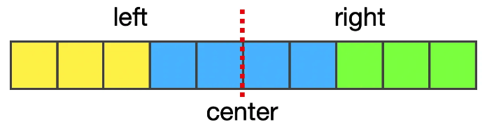 빨간선을 기준으로 나눈 left, right 와 중간지점을 포함한 center까지 총 세 구간의 최대값을 계산해 나갑니다.