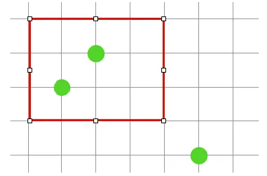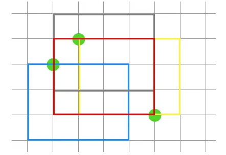 빨간색 그물을 설치하는 경우는 3마리를 모두 잡을 수 있지만 회색, 노란색, 파란색등의 그물은 분명 물고기랑 인접해 있지만 3마리를 다 잡지 못하는 것을 알 수 있습니다. 물고기의 위치에 따라 모든 그물의 위치를 전부 다 해보는 방법도 있겠지만 그렇게 한다면 고려할 것이 너무 많습니다. 따라서 그물이 위치할 수 있는 범위만 고려하는 방법을 사용하겠습니다. 각각의 물고기의 y좌표, 혹은 x좌표를 기준으로 범위만 지정하는 것입니다.