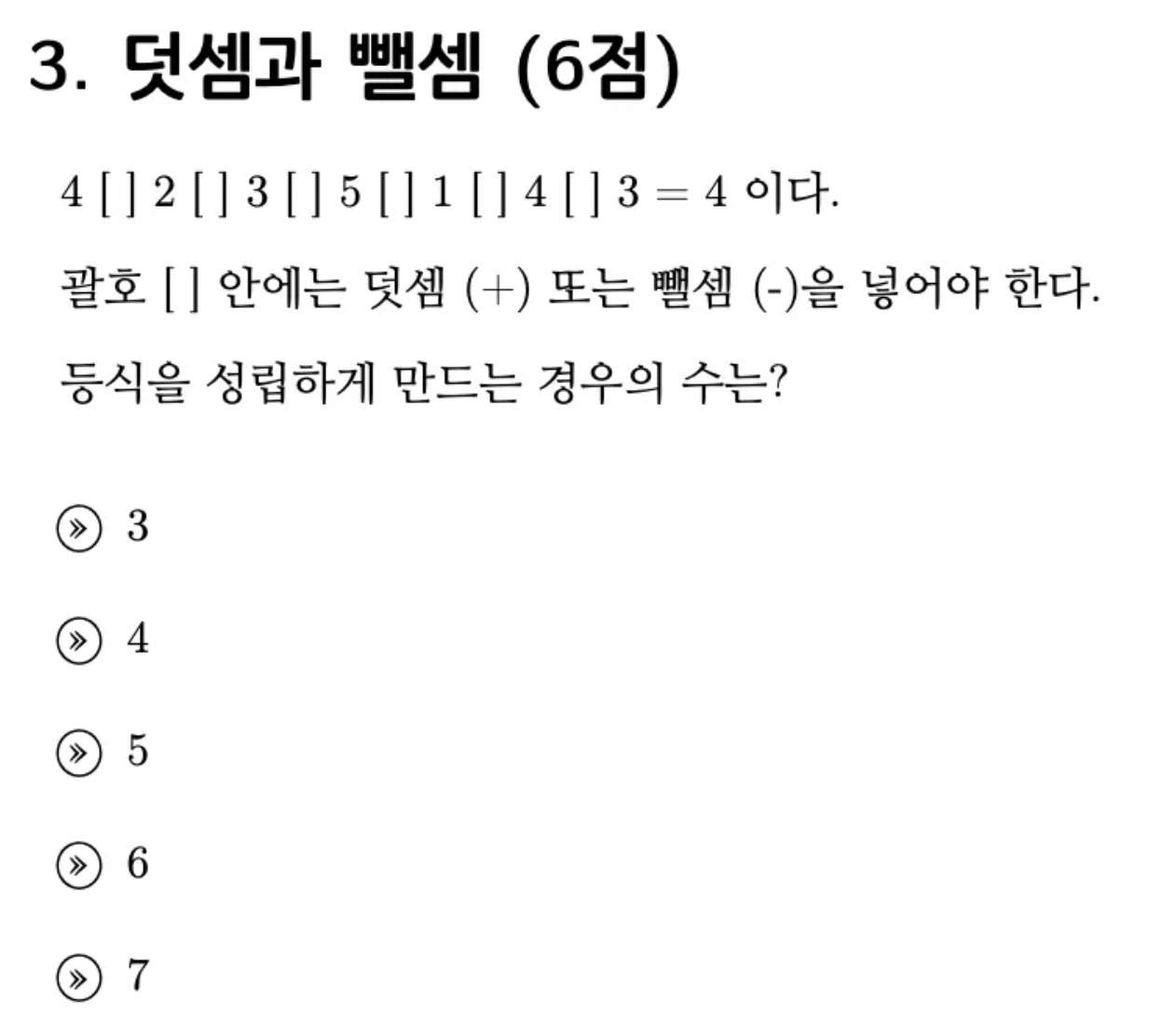 괄호는 총 6개로 + 또는 - 가 들어가는 경우 $2^6$ 으로 총 64가지가 있습니다. 그냥 무작정 넣어서는 너무 많은 시간을 잡아먹게 되어 다른 방식으로 접근해야 합니다.