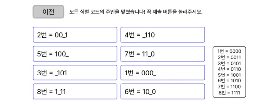 어느 글자를 가리더라도 각각의 번호가 유일할 수 있도록 해야 합니다. 각각을 숫자로 생각하지 않고 구별하기 위한 기호라 생각하고 번호를 만들어 줍니다. 첫 번째로 1번부터 8번까지 00001111 을 입력 합니다.