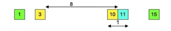 다음으로 생각할 것은 회의 세트 입니다. 회의 세트는 범위를 이야기 해주고 그 범위 안에 있는 집들을 이야기 합니다. 예제를 보면 회의 세트의 L과 R은 각각 3과 11 입니다. 이 말은 3번과 11번 사이에 있는 3번, 10번, 11번 집이 회의에 참석한다는 뜻입니다.