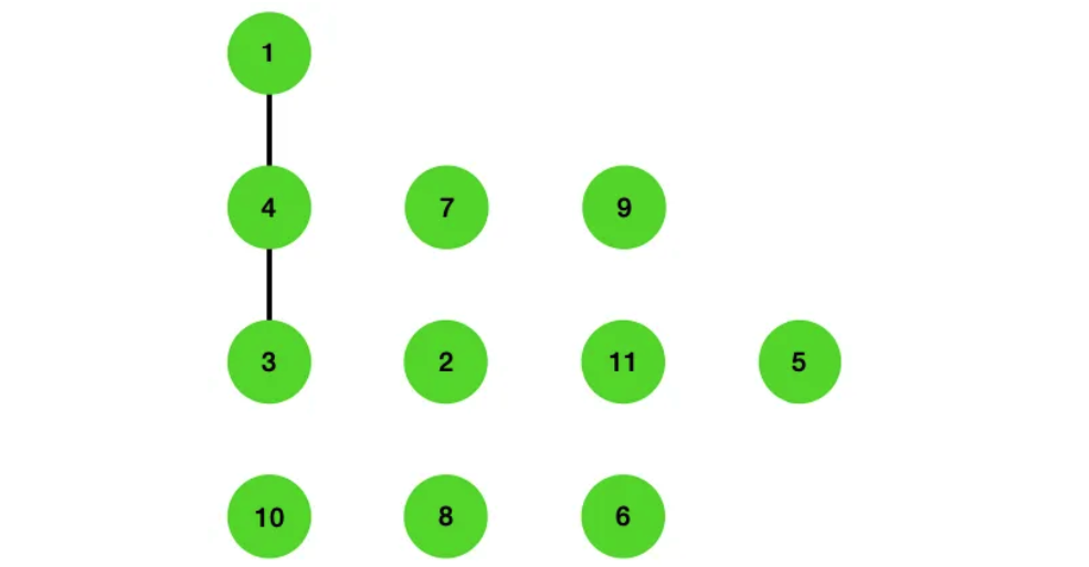 이제 N - 1개의 (1)번 형태의 쿼리와, Q개의 (2)번 형태의 쿼리가 주어집니다. 0으로 시작하는 (1)번 쿼리는 연결된 정점을 삭제합니다. 첫 번째 쿼리인 (0 11)은 11번 정점의 연결을 삭제합니다.