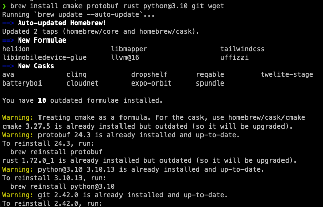 저는 이미 한 번 설치한 것을 또 다시 설치한 것이라 다른 형태로 출력될 수 있습니다. 이 명령은 brew를 통해 다양한 프로그램을 설치하는 것입니다. 하나하나 설명하자면 다음과 같습니다.