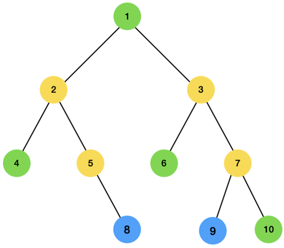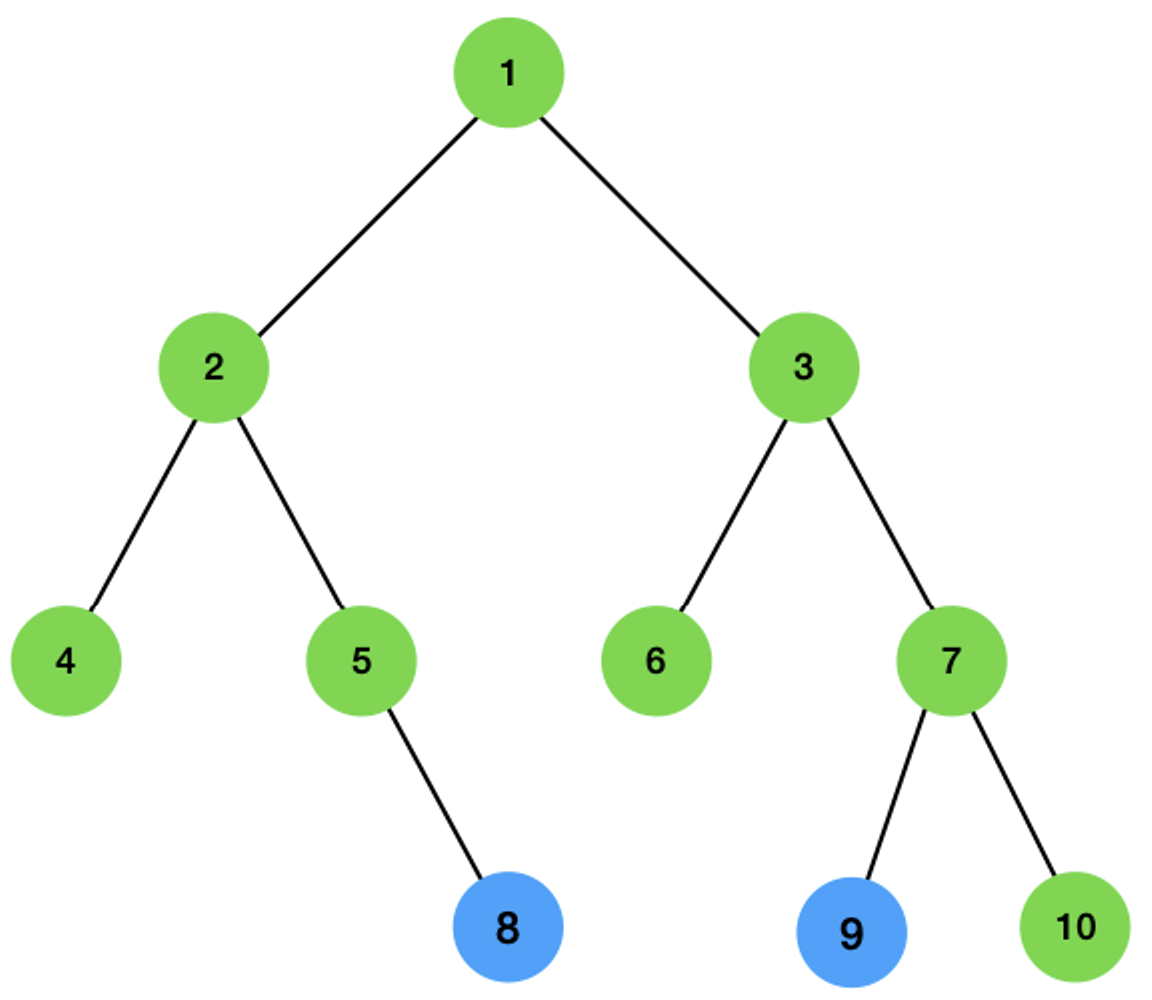 8번과 9번의 최소 공통 조상을 찾는다고 해보겠습니다. 두 정점의 부모를 찾아 올라갑니다. 먼저 8의 부모인 5와 9의 부모 7이 됩니다.