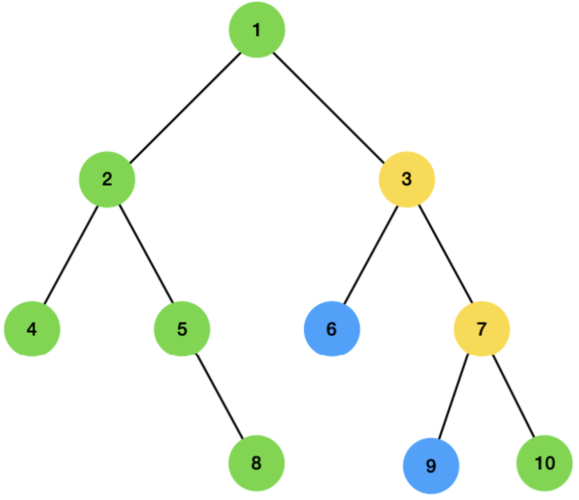 6은 깊이가 2이고, 9는 깊이가 3이기 때문에 두 깊이를 맞춰주기 위해 9만 부모를 찾아 올라갑니다. 그럼 7이라는 부모를 찾을 수 있고, 6과 7의 깊이가 같음을 알 수 있습니다. 이제 둘 다 한 칸 위로 올라갑니다.